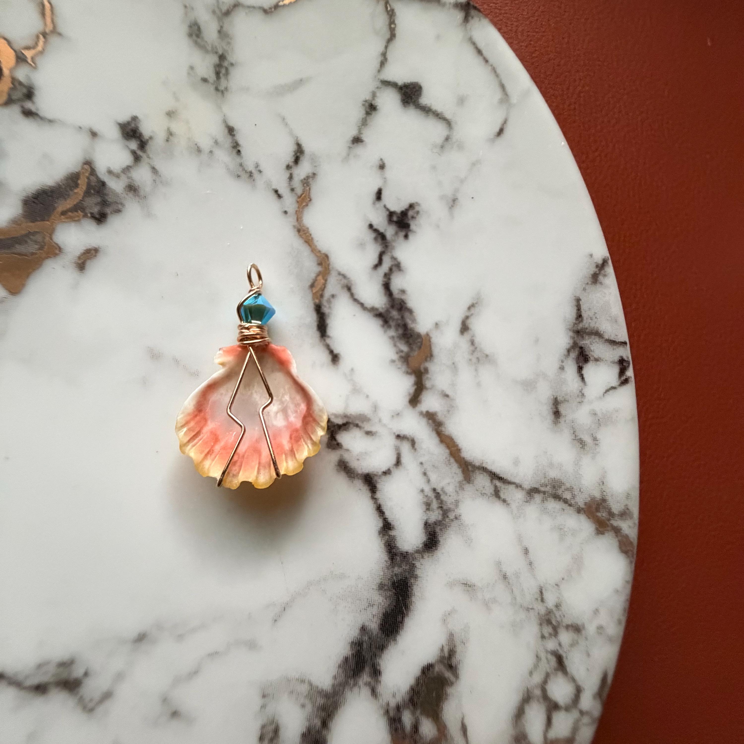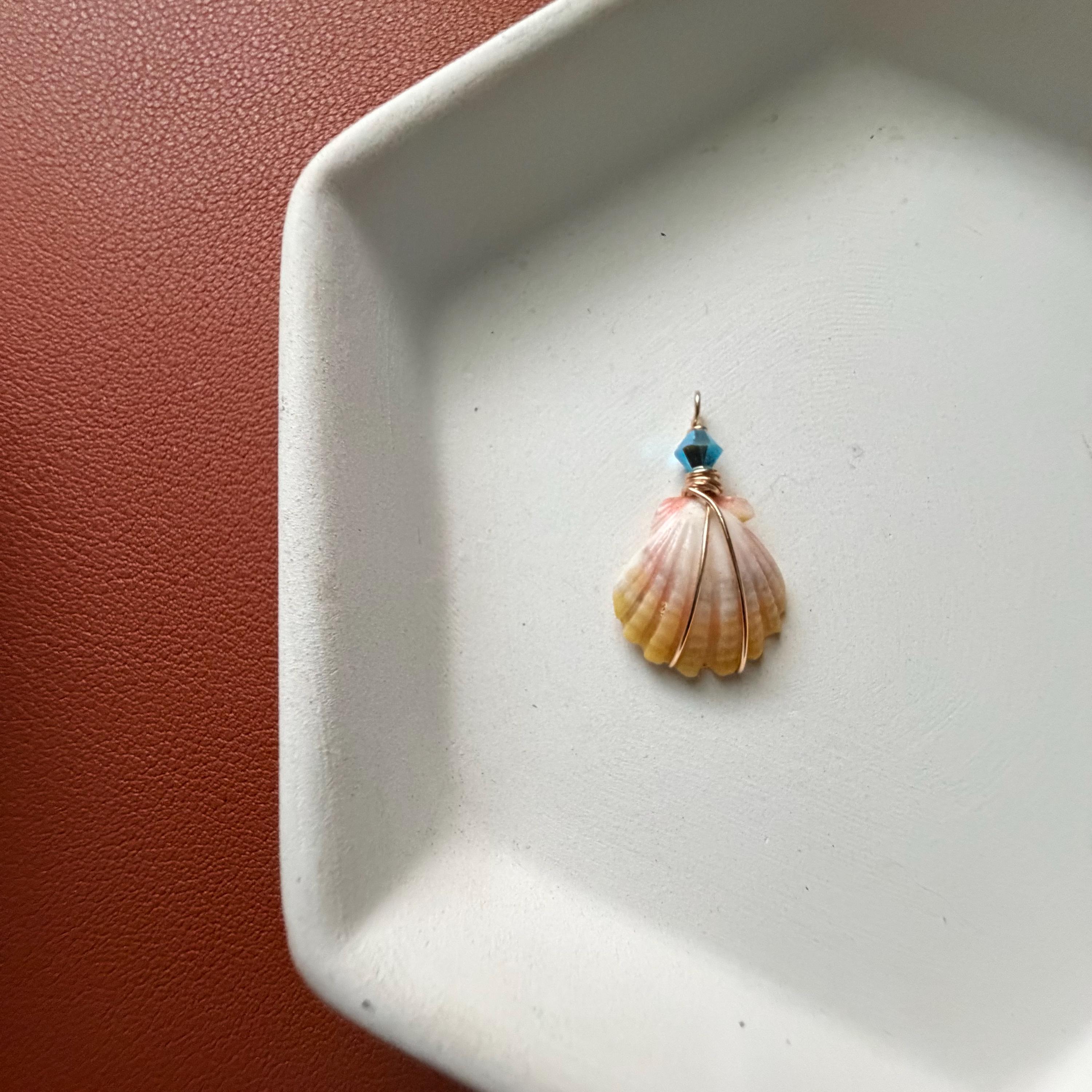 Waikiki Sunrise shell necklace with a simple Blue accent. Sunrise shell is Nickel Size and is set in 14k Gold Filled. Can be bought as a necklace or pendant alone. This item is one of a kind contact me for personal pieces!