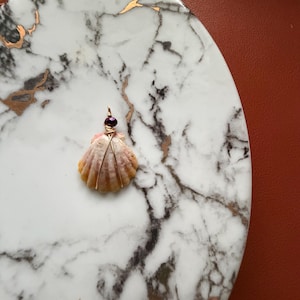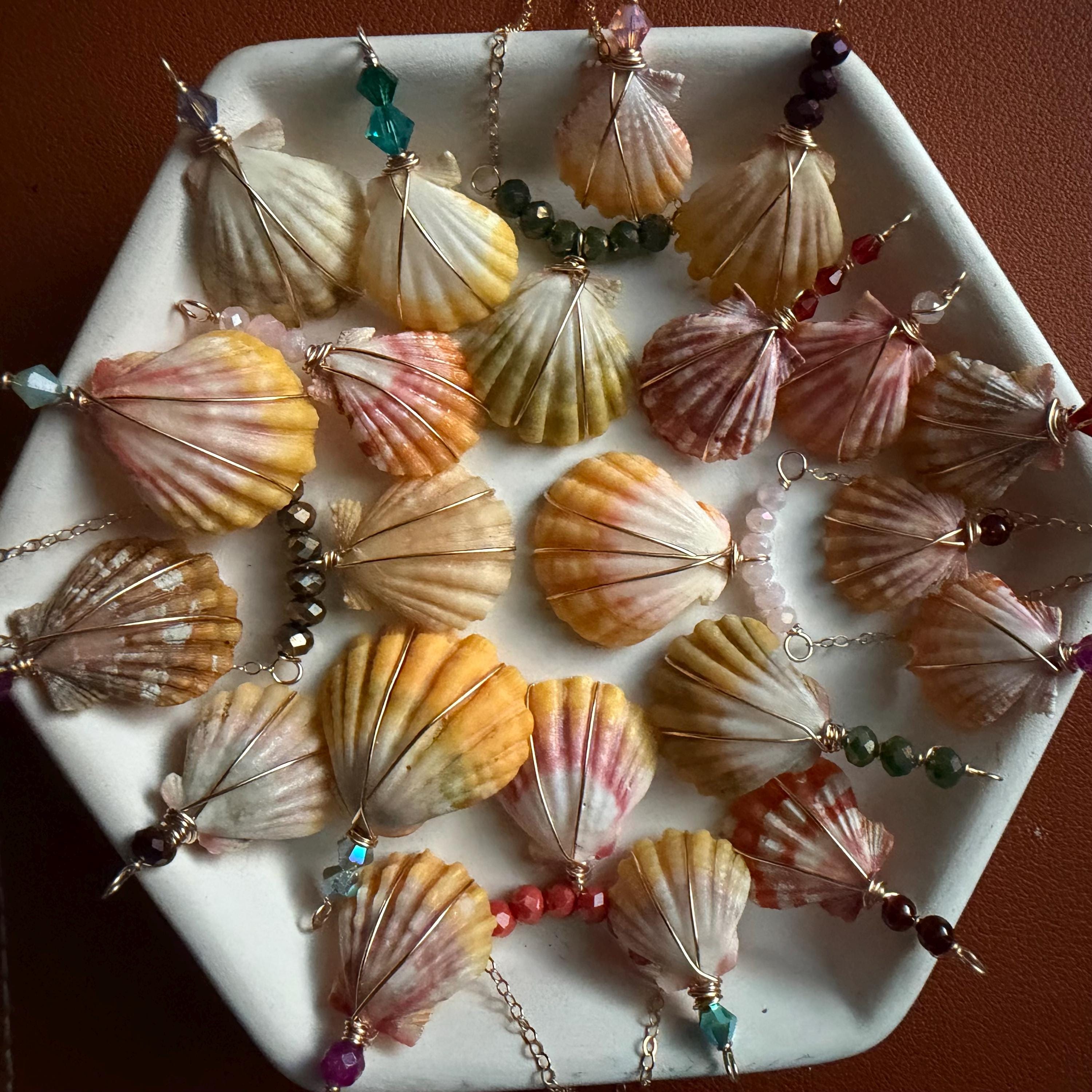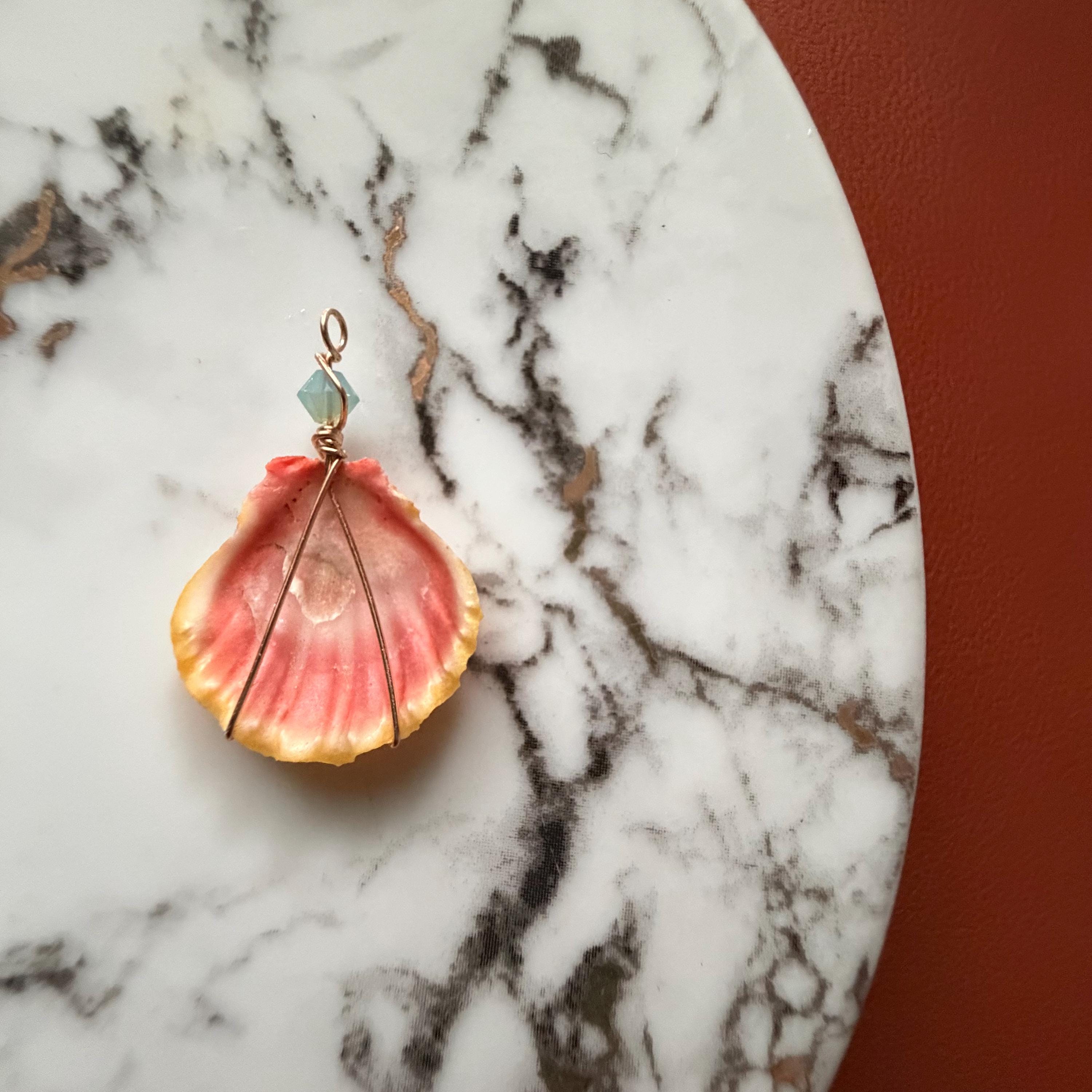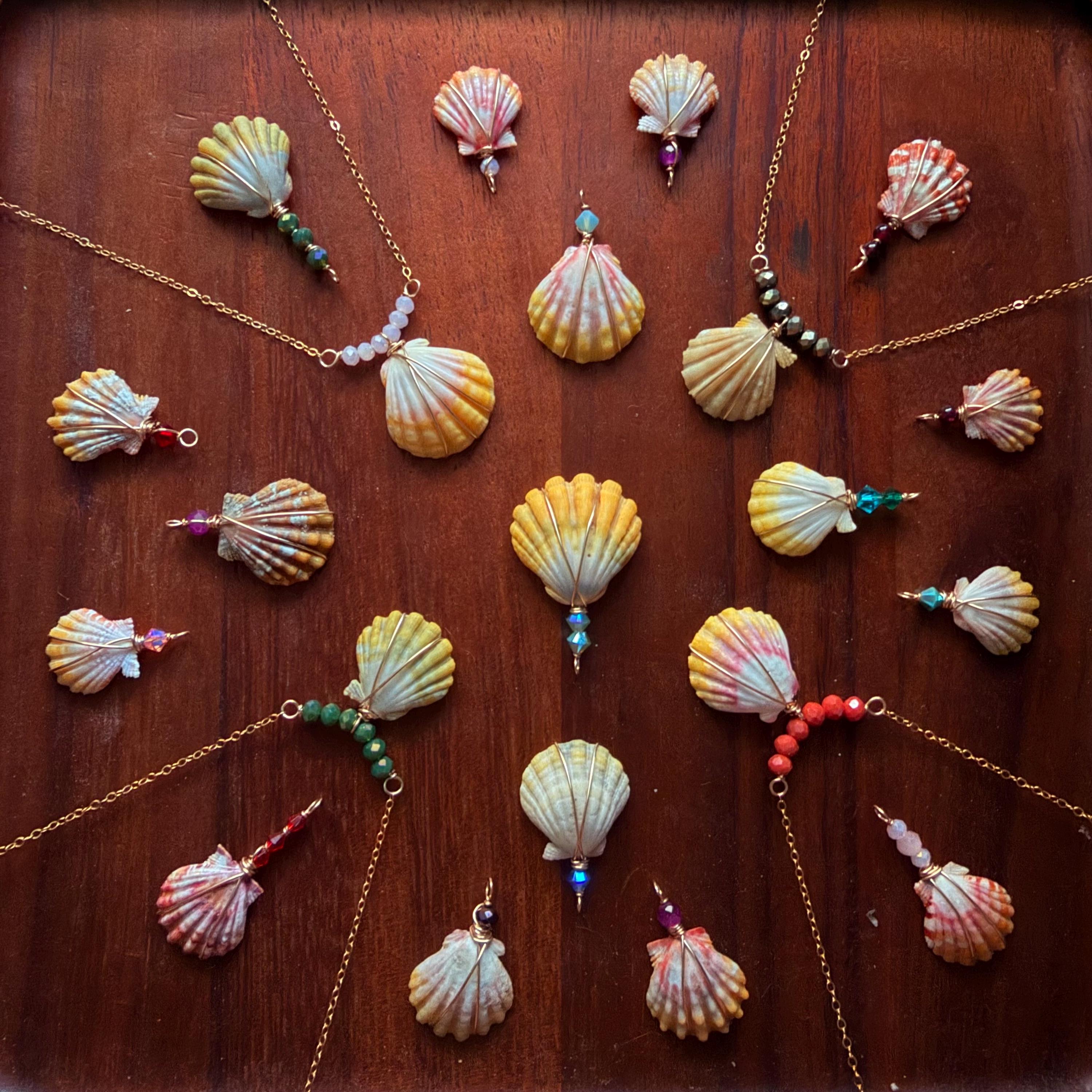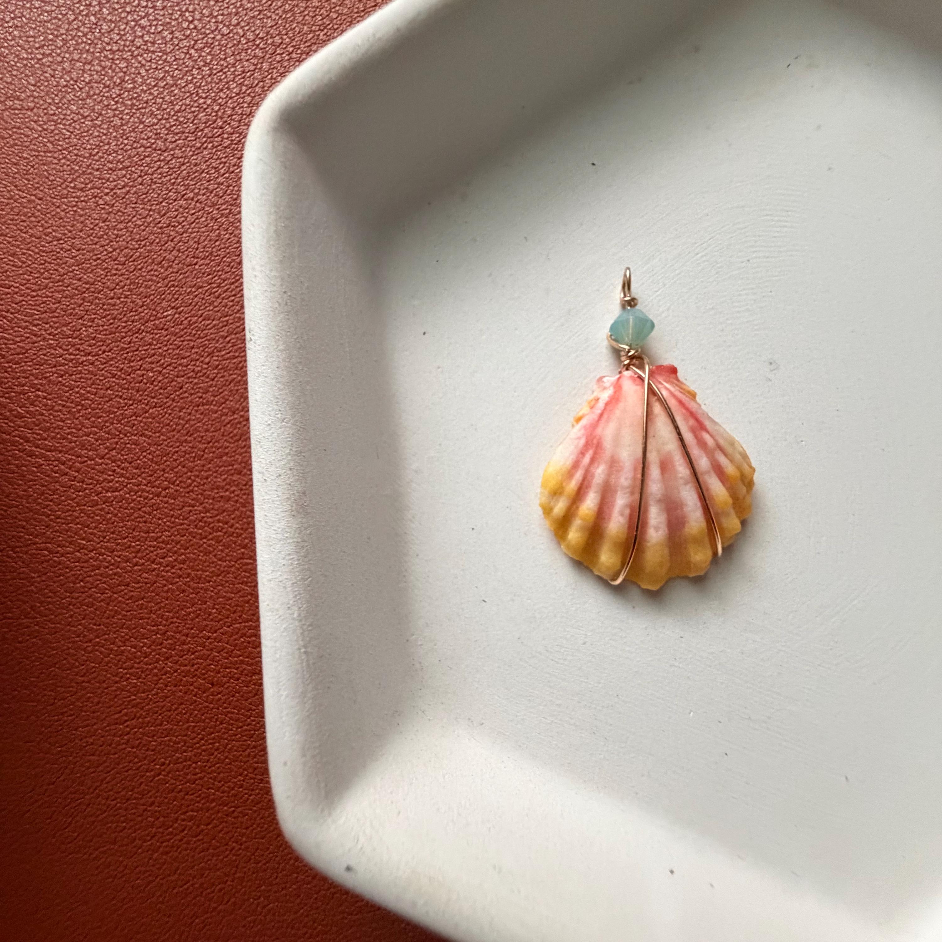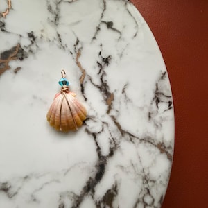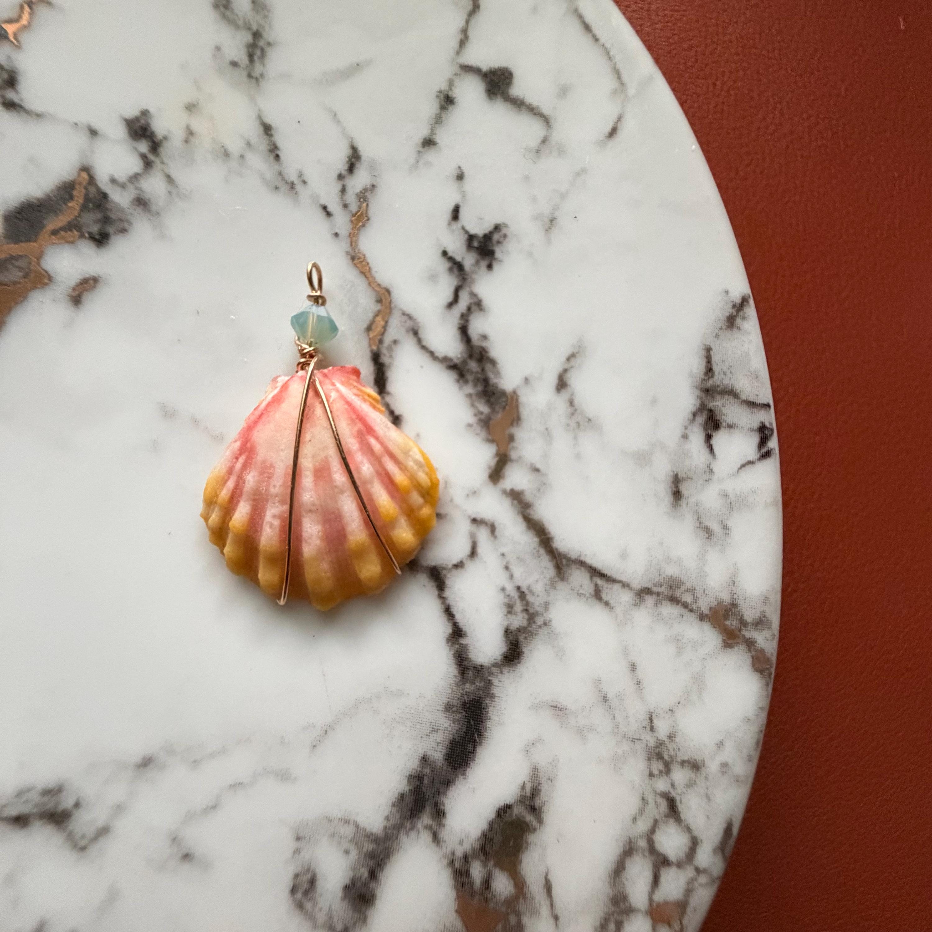 Northshore Sunrise shell necklace with a simple Blue accent. Sunrise shell is Nickel Size and is set in 14k Gold Filled. Can be bought as a necklace or pendant alone. This item is one of a kind contact me for personal pieces!